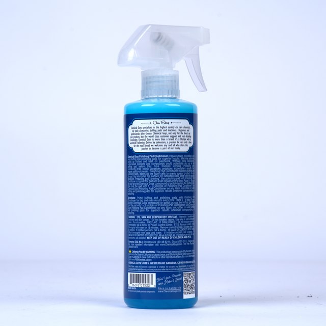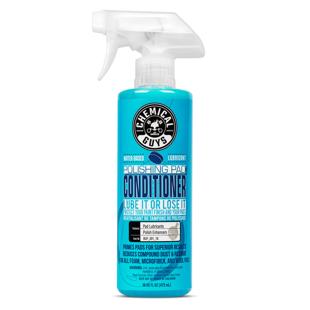 Machine polishing is the fine detailing art that balances machine power, abrasives, and friction to remove swirls and scratches, and restore luster to paint. Dry buffing pads generate excess heat and cause marring and other inconsistent paint removal marks. Chemical Guys Polishing Pad Conditioner lubricates buffing pads and polish abrasives to extend work time, reduce marring marks, and reduce the chances of burning paintwork from excess pad friction.