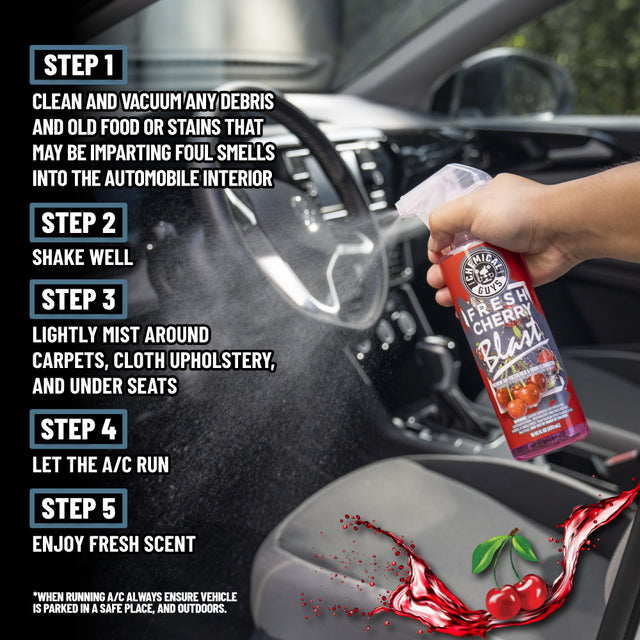 Indulge in the Irresistible Scent of Fresh Cherries! Fill your ride's interior with the sweet, juicy scent of sun-ripened cherries with Chemical Guys Cherry Blast Air Freshener. This delectable scent is the perfect thing to turn virtually any space into a sweet-smelling escape. Enhance your interior with a trio of hanging air fresheners that add swagger while delivering just the right amount of that delicious cherry scent - perfect for cars, trucks, SUVs, and RVs. The versatile 16 oz spray is ready to freshen up your car, home, or office, and bring the delicious scent of fresh cherries anywhere you crave it!