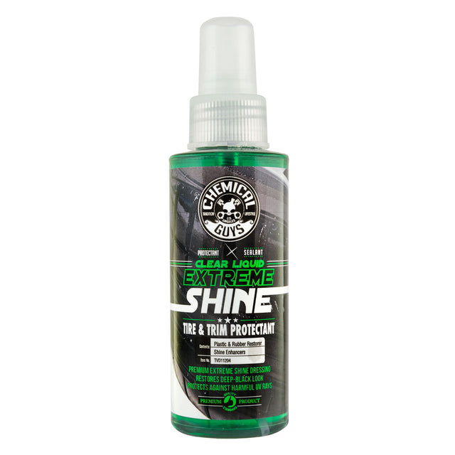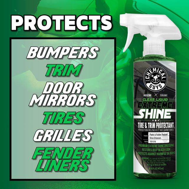 Spread Clear Liquid Extreme Shine with any foam applicator pad or soft brush to restore a deep-black and new appearance on faded bumper trim, door mirrors, grilles, fender liners, tires, and more. The no-streak, no-run, and no-drip formula repels water, detergent, and solar rays to keep trim and tires hydrated, supple, and looking like new.