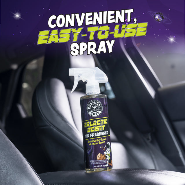 Blast off to new heights of scent satisfaction with Chemical Guys Galactic Scent Air Freshener Spray. This exhilaratingly crisp, woodsy scent is specially formulated to transport you to an exotic-smelling intergalactic oasis, far away from any bad smells you may encounter in your ride's interior.