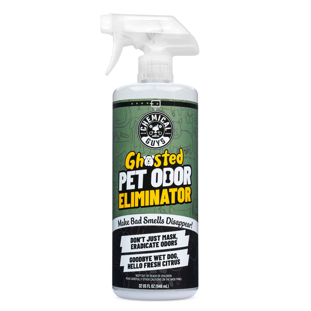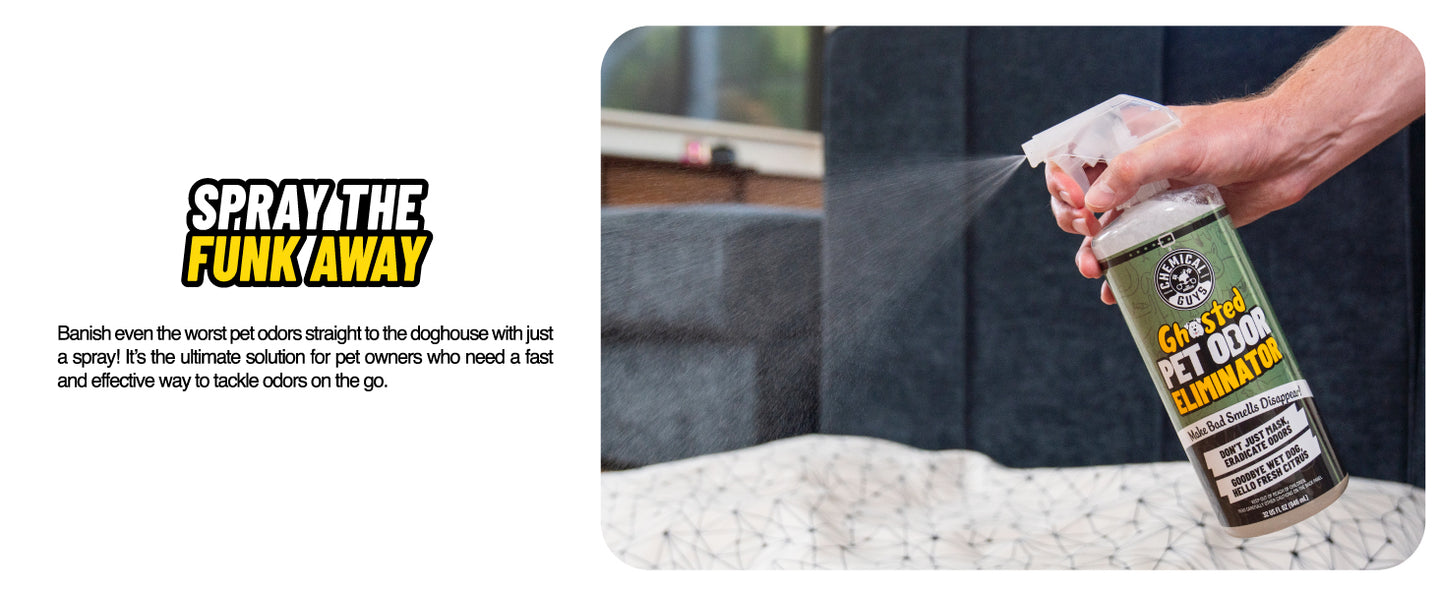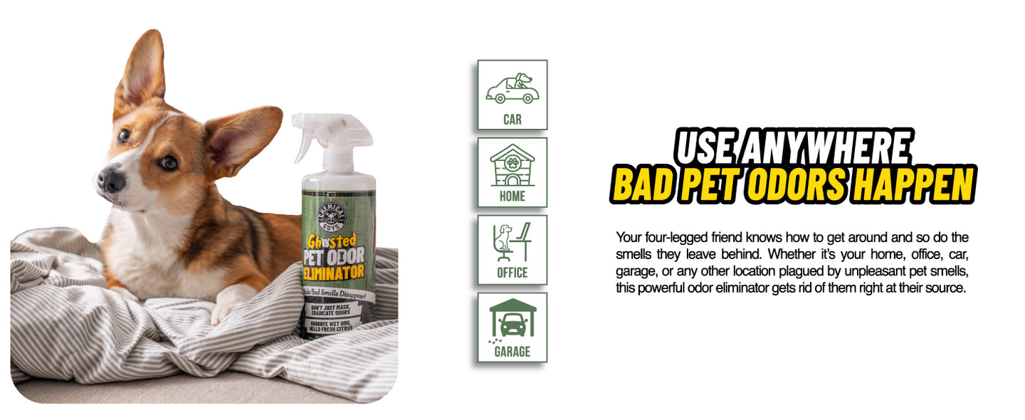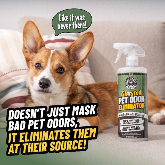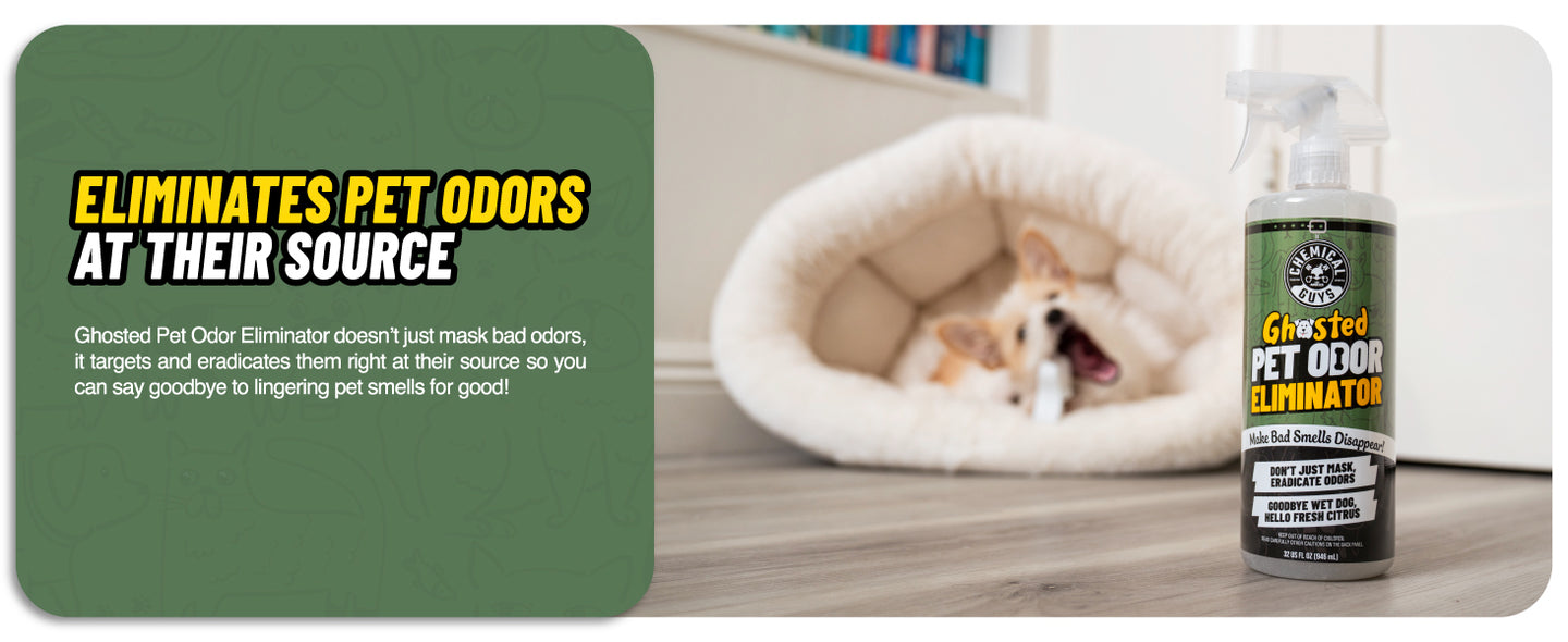 You love your pet, but you may not love the trail of smells they leave behind. From the passenger seat in your car to the living room in your home, odors tend to linger long after the tail stops wagging. Ghosted Pet Odor Eliminator is your solution. It doesn’t just mask the unpleasant smells, it eliminates them on a molecular level, leaving the space fresh like the smells never existed with just a hint of a light citrus scent.