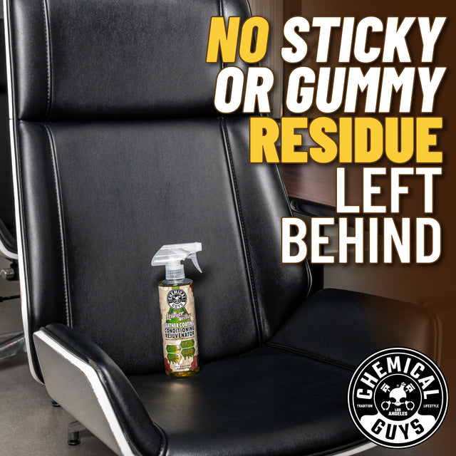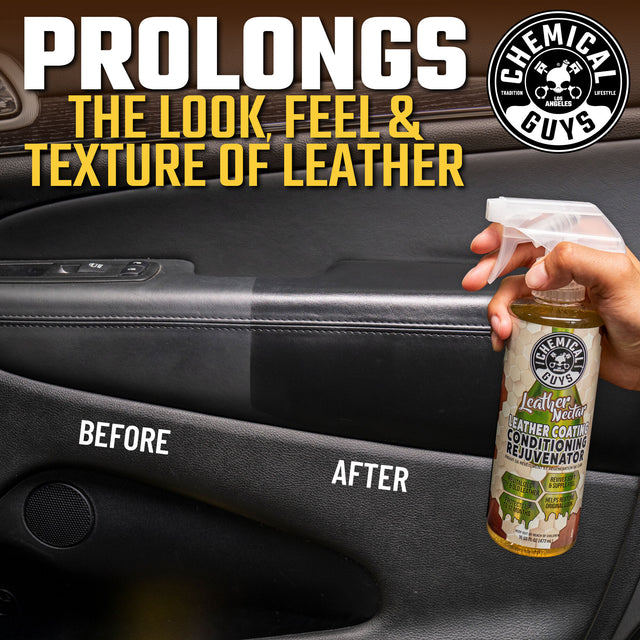 Chemical Guys Leather Nectar Leather Coating Conditioning Rejuvenator is a powerful leather restorer that penetrates deep into the pores of leather, moisturizing it to restore long lost softness, suppleness, and richness to help maintain and prolong the elegant look, feel, texture, and brilliance of leather.