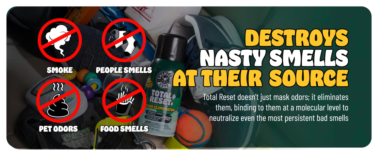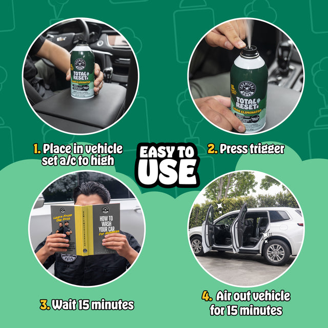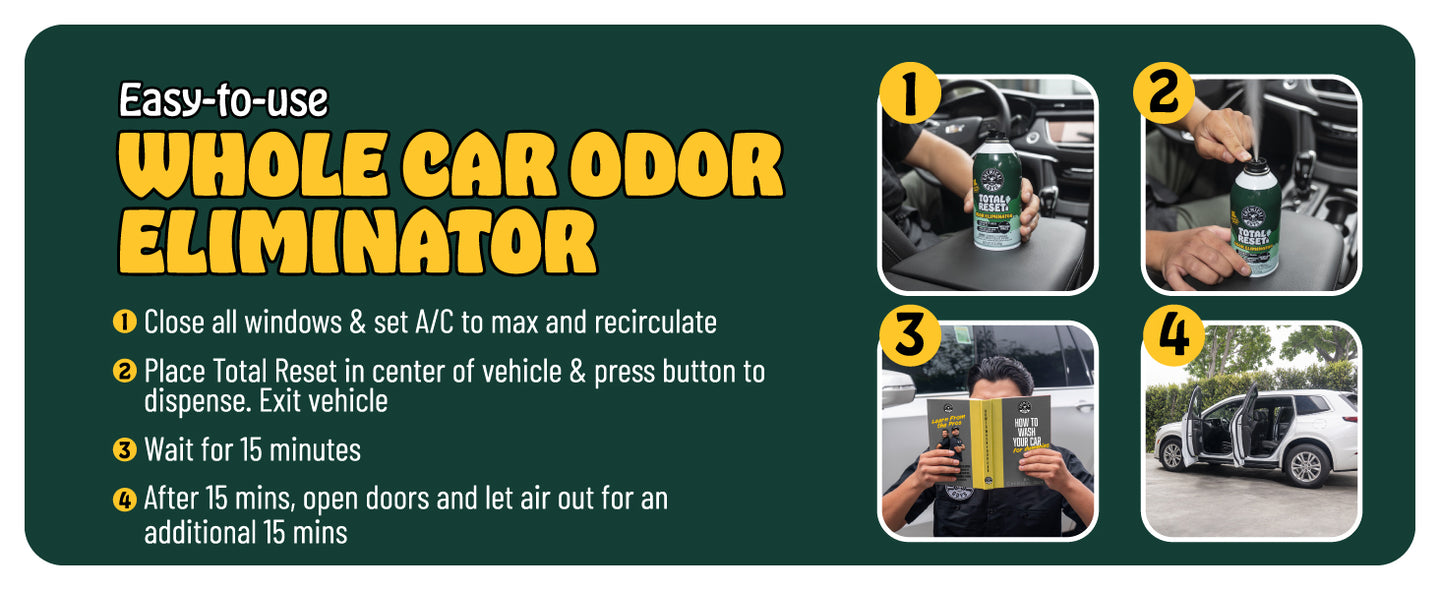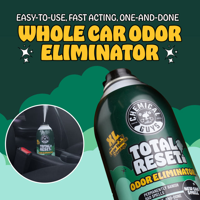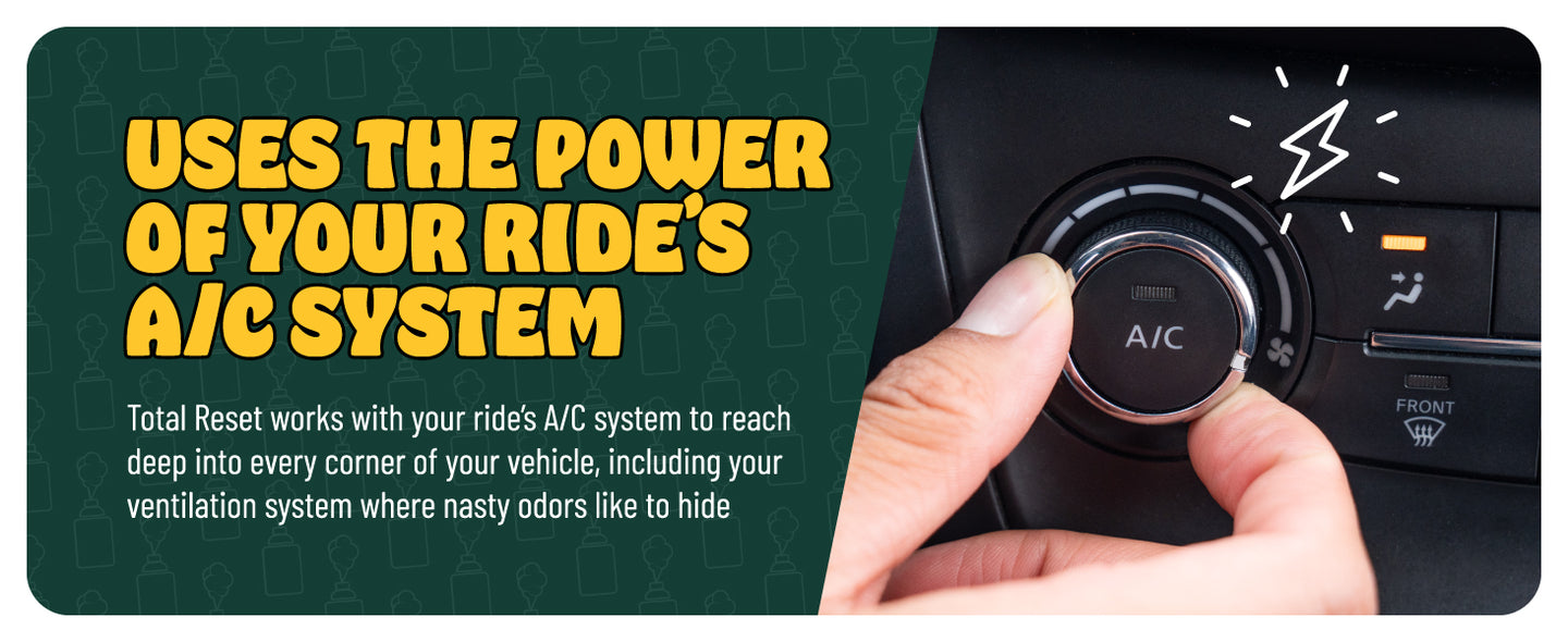 Total Reset harnesses the power of your ride's A/C system to reach deep into vents, carpets, and hidden nooks where foul smells like to hide. This one-use odor eliminator blasts away unpleasant odors wherever they may be hiding, leaving your car, truck, SUV, or RV's interior filled with the crisp, invigorating scent of a brand-new car!