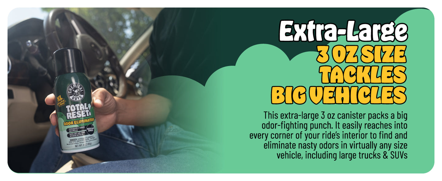 Refresh your ride's interior and destroy nasty smells at their source with this easy-to-use, extra-large, one-and-done 3 oz whole car odor eliminator that’s powerful enough to tackle bigger vehicles, like trucks and SUVs, with just one canister.