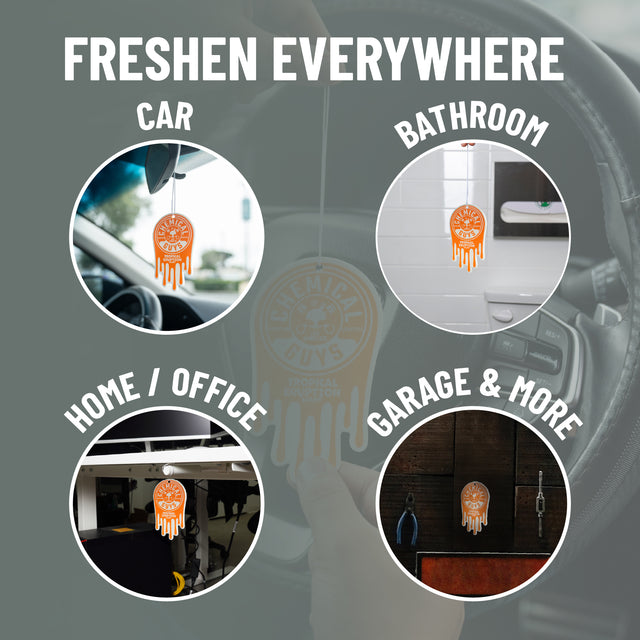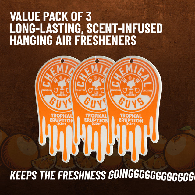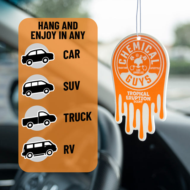 Featuring the iconic Chemical Guys logo with an eye-catching dripping design in juicy tangelo orange, these hanging air fresheners look great anywhere you hang them.