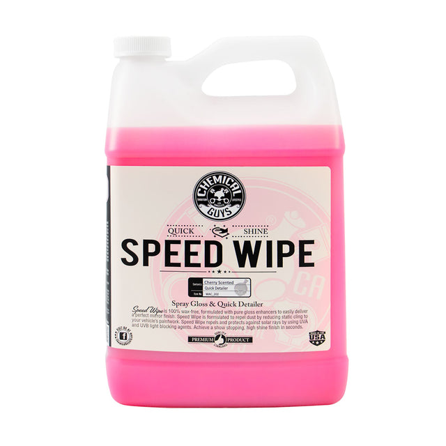Get a showroom-worthy finish with Speed Wipe. This premium quick detailer removes contaminants like dirt, fingerprints, and road grime, reducing static cling to keep surfaces cleaner for longer. The high-gloss finish leaves behind a dazzling shine with no streaks or waxy residue. Its advanced formula not only cleans but protects, forming a defensive barrier against UV rays to extend the life of waxes and sealants.