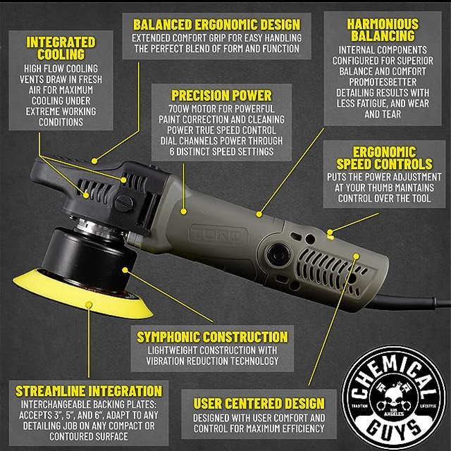 The TORQX is the dual action polisher of choice for any beginner, hardcore enthusiast, or professional detailer looking for one simple, lightweight, and powerful machine that can do it all. With the TORQX, anyone can polish paint, remove swirls and scratches, spread wax and sealant, scrub carpet, clean and restore clarity to headlights, and more. The powerful 700 watt motor, 8mm dual action orbital throw, and compact design deliver powerful and consistent polishing, paint correction, and cleaning results with minimal fatigue and wear on the user.