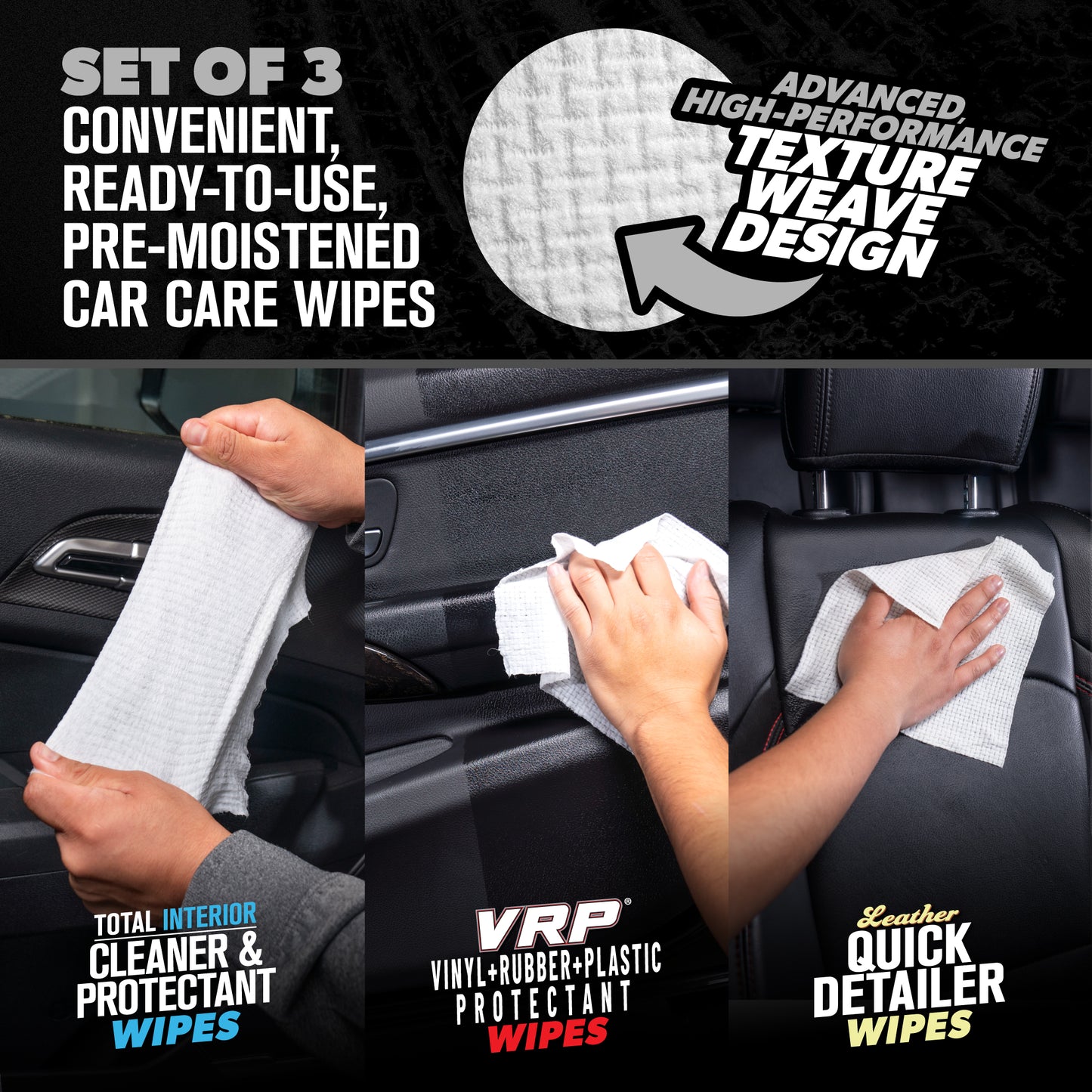 VRP Wipes clean and shine vinyl, rubber, and plastic while leaving behind a layer of restorative protection that helps prevent cracking, fading, and discoloration caused by harmful UV rays and daily wear. With regular use, your vinyl, rubber, and plastic surfaces will maintain their original appearance and durability.