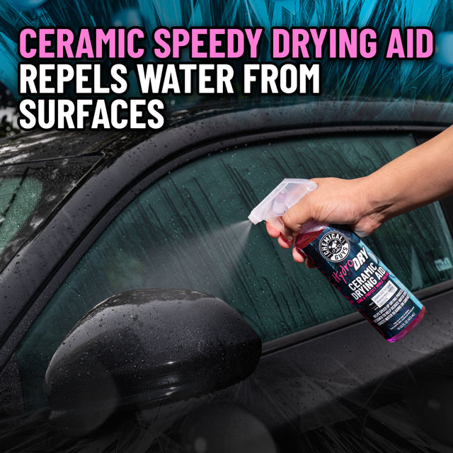 HydroDry Ceramic Drying Aid helps speed up drying by helping release water from paint, glass, and trim, allowing it to be easily wiped away. Just spray on a wet ride and dry as you normally would. It is the perfect way to save time while leaving your ride with ceramic shine and protection.