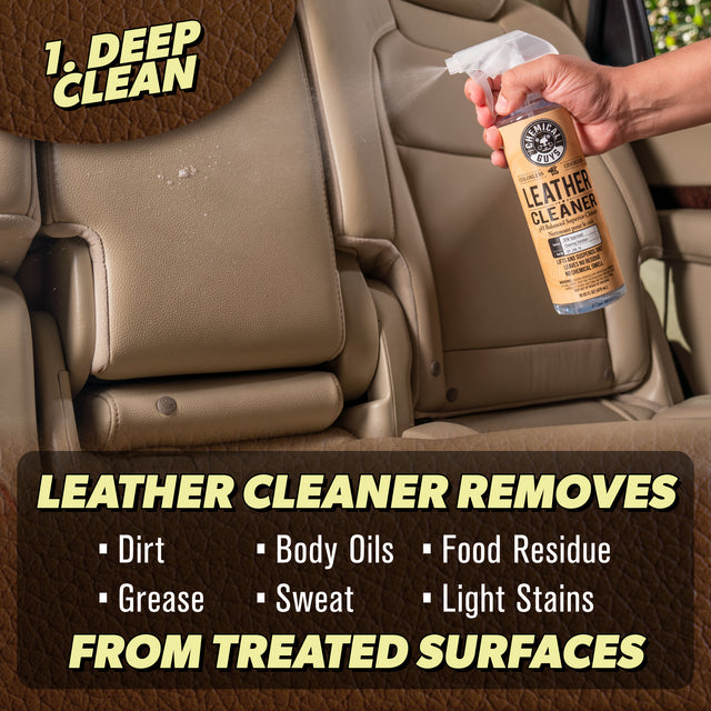 This leather care kit includes what you need to clean, condition, protect, and maintain your leather surfaces. Leather Cleaner deep cleans leather surfaces, removing dirt, grease, body oils, sweat, food residue, and light stains from fine natural leather, durable sealed leather, and synthetic leather materials. Leather Conditioner hydrates and nourishes leather surfaces, leaving them with a like-new, matte finish.