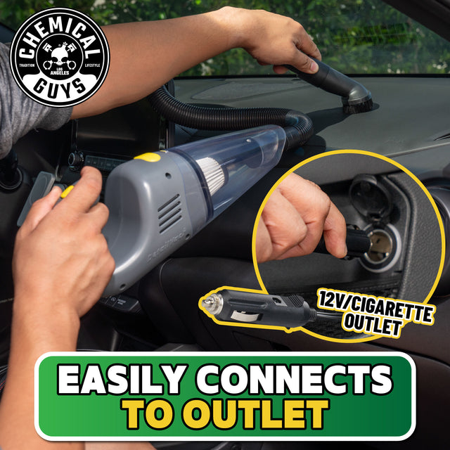 The DetailVac is a nimble vacuum cleaner with a powerful 110W motor that delivers strong suction for on-the-go car cleaning. Simply plug the 12V DC cable into your car's power outlet or cigarette lighter and vacuum away. The DetailVac is easy to use, with unmatched cleaning ability and comfort due to the lightweight design and curved easy-grip handle.