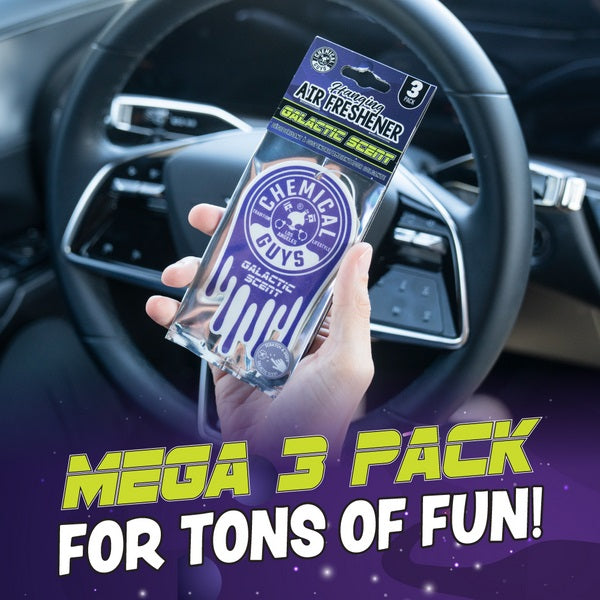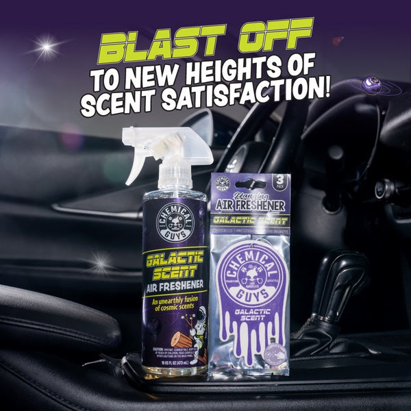 Blast off to new heights of scent satisfaction with Chemical Guys Galactic Scent Air Freshener Bundle. This exhilaratingly crisp, woodsy scent is specially formulated to transport you to an exotic-smelling intergalactic oasis, far away from any bad smells you may encounter in your ride's interior.