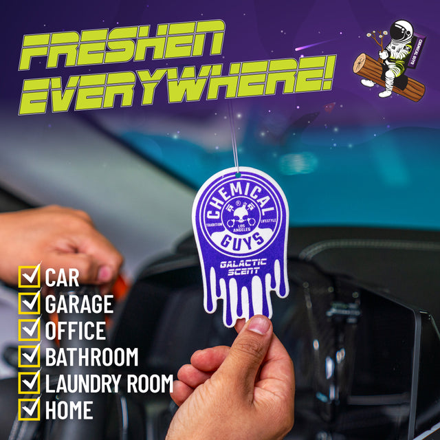 Blast off to new heights of scent satisfaction with Chemical Guys Galactic Scent Hanging Air Freshener. This exhilaratingly crisp, woodsy scent is specially formulated to transport you to an exotic-smelling intergalactic oasis, far away from any bad smells you may encounter in your ride's interior.