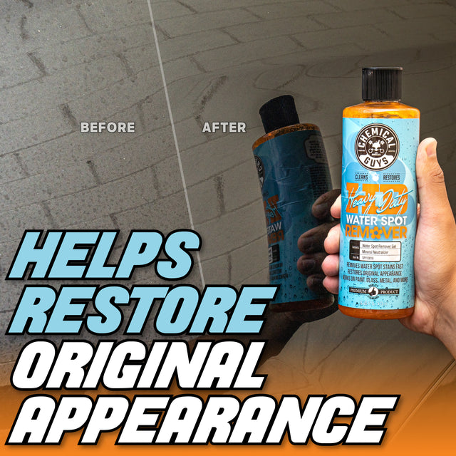 Heavy Duty Water Spot Remover erases alkaline water mineral stains from paintwork, glass, and polished metal surfaces. Its mild, acid-based formula safely neutralizes even the most stubborn water spots and easily cleans up when you use water, detail sprays, and waterless cleaning solutions. Using Heavy Duty Water Spot Remover also preps your surfaces for waxing and sealants, providing extra protection against water spots in the future.