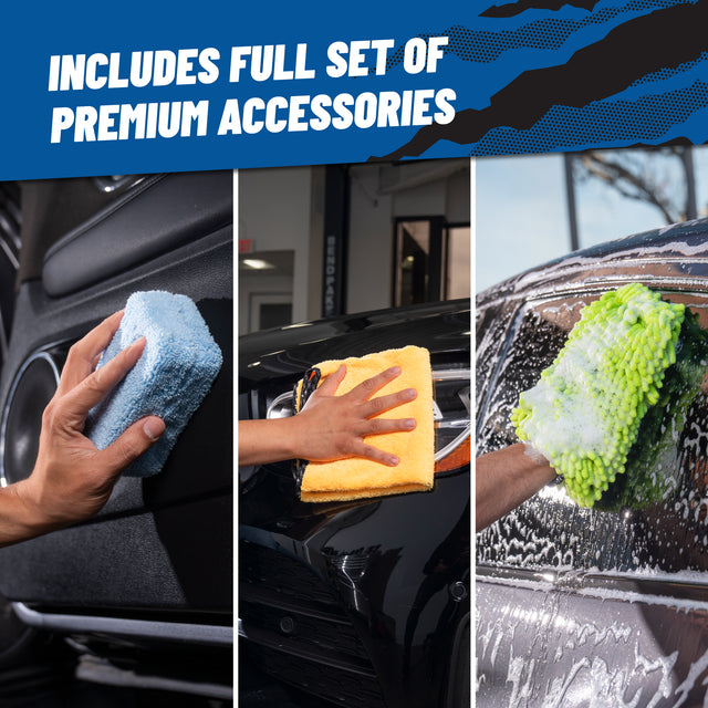 This kit comes fully loaded with premium washing accessories to upgrade your wash from start to finish. The ultra-soft wash mitt holds tons thick, deep-cleaning suds, while the Premium Grade Microfiber Applicators evenly spread waxes, dressings, and protectants. The Professional Grade Silk Banded Microfiber Towels easily tackle a variety of drying and buffing tasks with a soft, absorbent touch.