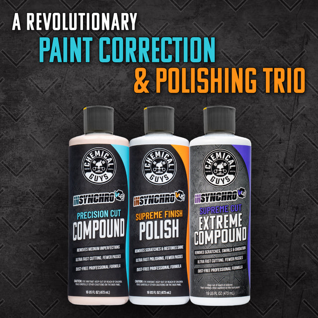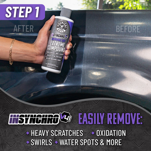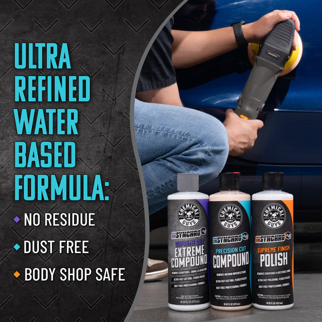 This kit is all about versatility and ease of use. Whether you’re using a dual-action or rotary polisher, or simply applying by hand, the included InSynchro V45 Finishing Polish, V43 Precision Cut Compound, and V41 Supreme Cut Extreme Compound deliver exceptional results. Their water-based formulas ensure minimal dust and residue, leaving your vehicle ready for the next step, whether it’s wax, sealant, or ceramic coating.