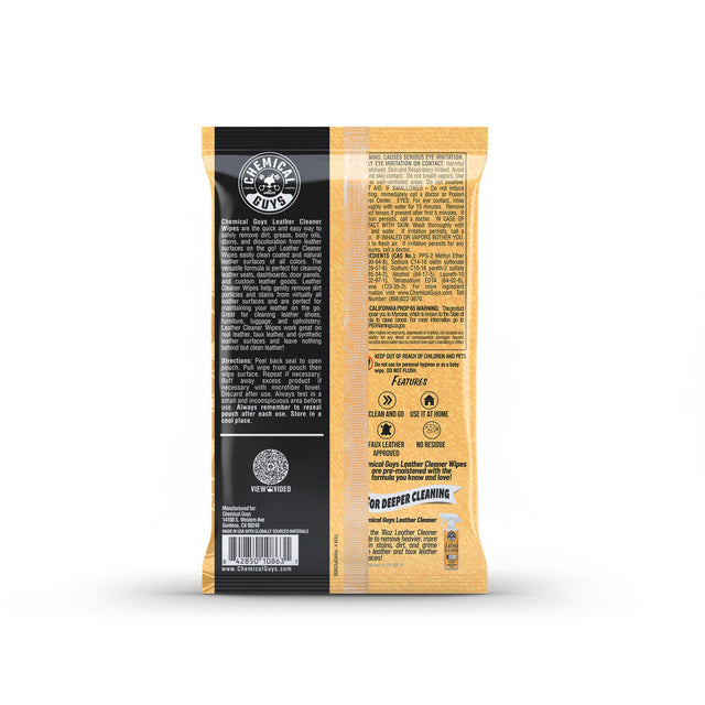 There’s nothing as smooth, soft, and silky as fine leather. Now it’s easy to preserve that fresh look and feel with Chemical Guys Leather Cleaner Wipes. Pre-moistened with our Leather Cleaner formula, these wipes are safe to use on colored leather and perfect for fine natural leather, durable sealed leather, synthetic leather, or vinyl.