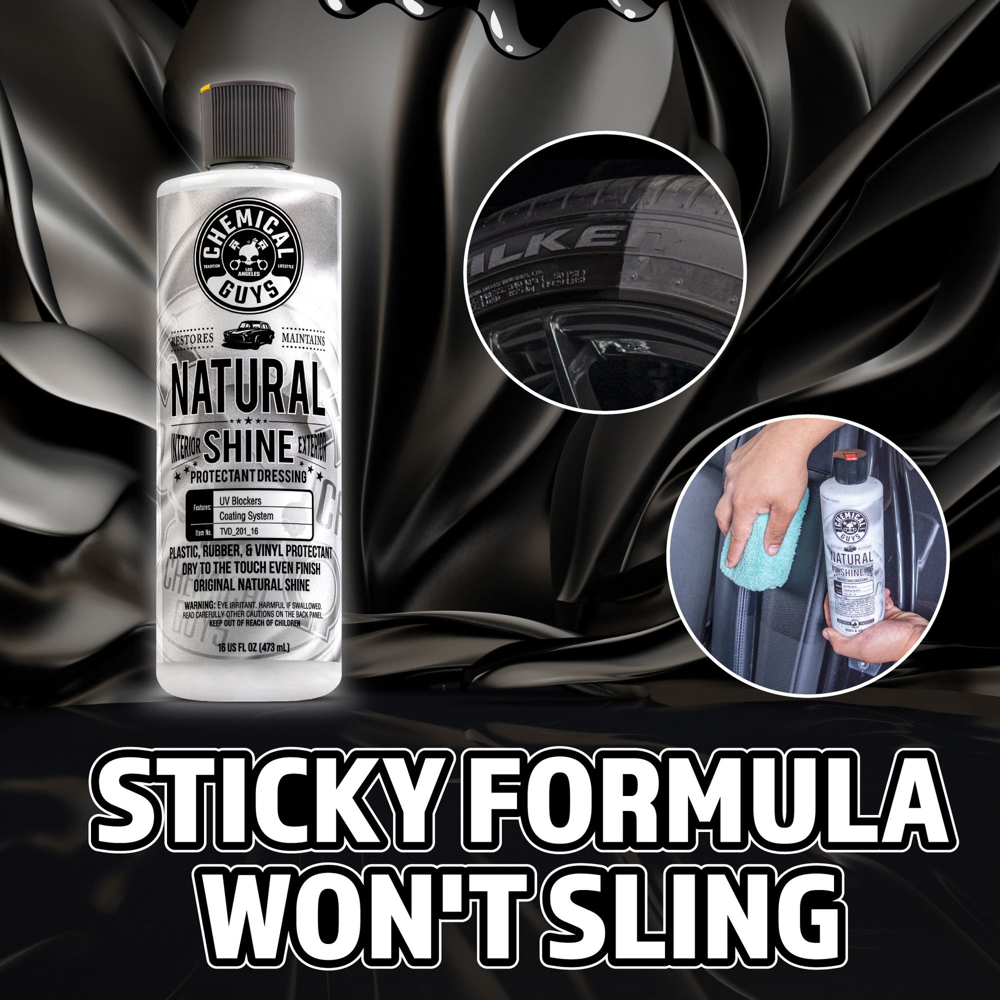 Natural Shine is a premium dressing that uses synthetic polymer coating technology to restore a classic, low-sheen, dry-to-the-touch shine to your plastic, rubber, and vinyl surfaces. Use both inside and outside your car.