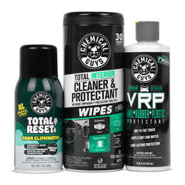 This interior refresh kit combines three Chemical Guys favorites to clean surfaces, maintain trim, and freshen your cabin. Total Interior New Car Smell Wipes clean and protect interior surfaces, VRP refresh and protect vinyl, rubber, and plastic, and Total Reset Odor Eliminator helps eliminate lingering odors.