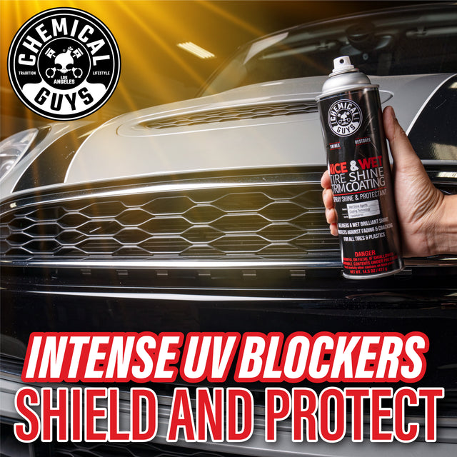 Harsh UV sunlight and intense heat can eventually cause a car’s tires and trim components to fade, crack, and break. Nice & Wet’s weatherproof formula clings to tires and trim, allowing moisturizing oils to nourish and restore a like-new feel and texture with a brilliant shine. Once dry, it leaves a protectant layer that shields tires and trim from the effects of sunlight and the elements for weeks, helping prevent cracking and fading.