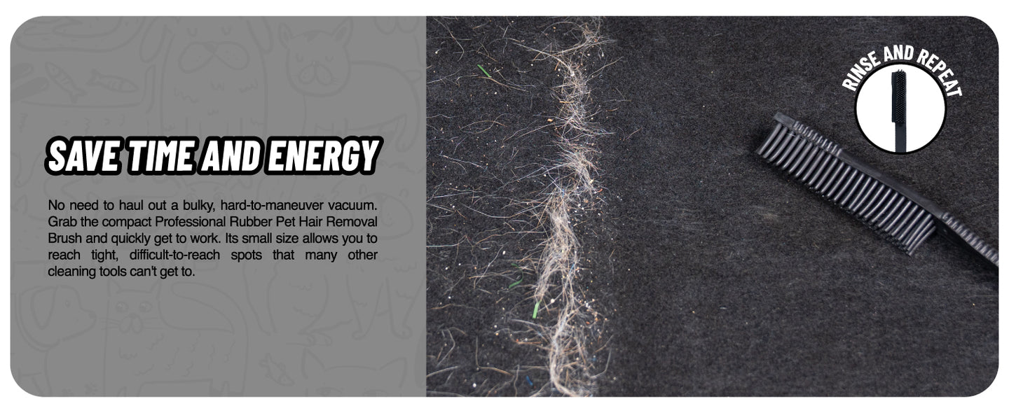 The Pet Hair Removal Brush uses soft, thick rubber bristles to quickly get rid of hair from seats, carpets, and upholstery. The large round rubber bristles gently comb through fabric fibers, loosening embedded hair and fur while creating static electricity that attracts loose hair like a magnet. No need for chemicals, vacuums, or hard work!