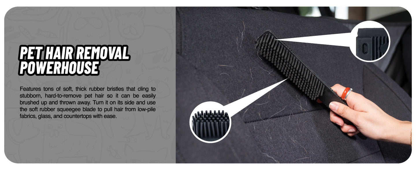 Turn the brush on its side to squeegee hair and fur from low-pile fabrics, glass, or countertops. With its special extra-large bristles and soft rubber material, this brush is completely safe to use and scratch-free. Great for cleaning car seats, floor mats, furniture, beds, clothes, and more!