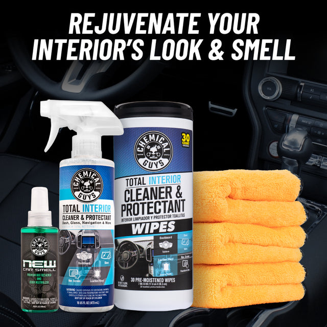 Clean and protect virtually any interior surface with two versions of Total Interior, both spray, and wipes, then leave your interior smelling awesome with New Car Smell Air Freshener Spray. This kit also includes premium microfiber applicators and towels to ensure you have everything you for the job.