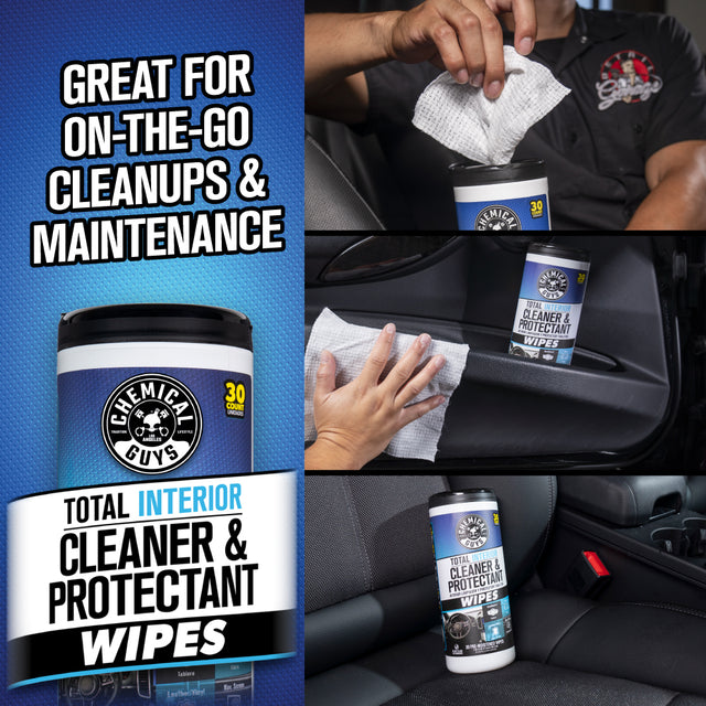 Total Interior wipes are your one-stop shop when it comes to cleaning your ride's interior in a flash. Use on everything from dashboards to steering wheels to navigation screens and glass. These wipes easily clean up light dirt, grime, fingerprints, debris, grease, and more in just a swipe. Total Interior Wipes also leave behind a layer of UV protection to help guard against future damage from the sun.