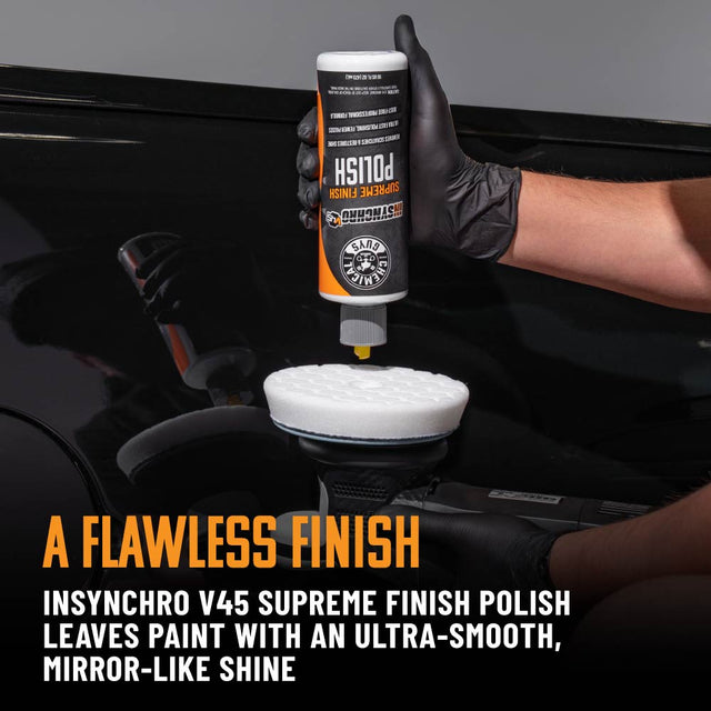 Follow up with InSynchro V45 Supreme Finish Polish to dial in a high-gloss, mirror-like finish that really makes your color and clear coat shine. Its adaptive micro-abrasives shrink as you work, letting you refine and perfect the surface with minimal haze, residue, or dust – perfect for prep before wax, sealant, or ceramic coatings.