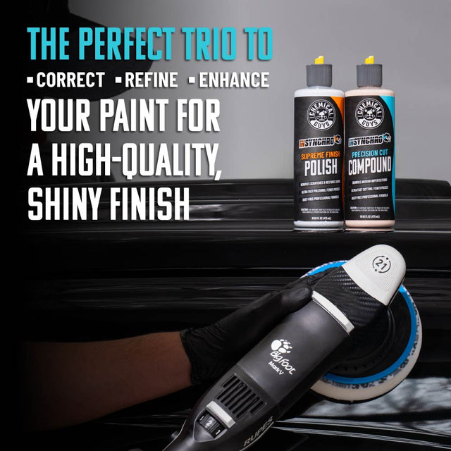 The InSynchro V43 Precision Cut Compound brings the muscle where you need it most. Deep scratches, stubborn swirls, harsh oxidation—V43 chews through heavy defects quickly while maintaining predictable behavior on the pad. Its advanced abrasives break down cleanly, helping you achieve serious correction without leaving behind unnecessary haze. It’s the kind of compound that makes even neglected paint feel like a redemption arc.