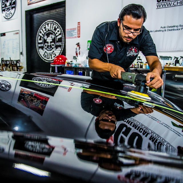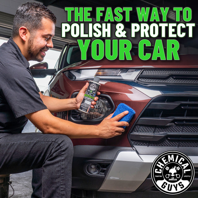 Without applying pressure, spread Slick Finish with a dual action polisher using a low speed while using a clean finishing foam pad. Spread over the entire vehicle in a thin, even coat. Allow Slick Finish Cleaner Wax to bond with surfaces for 15 minutes, then buff off with a premium microfiber towel for a brilliant shine.