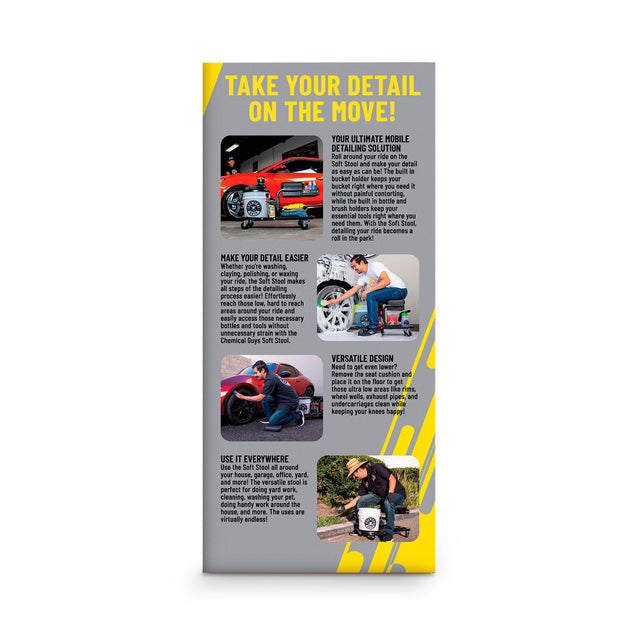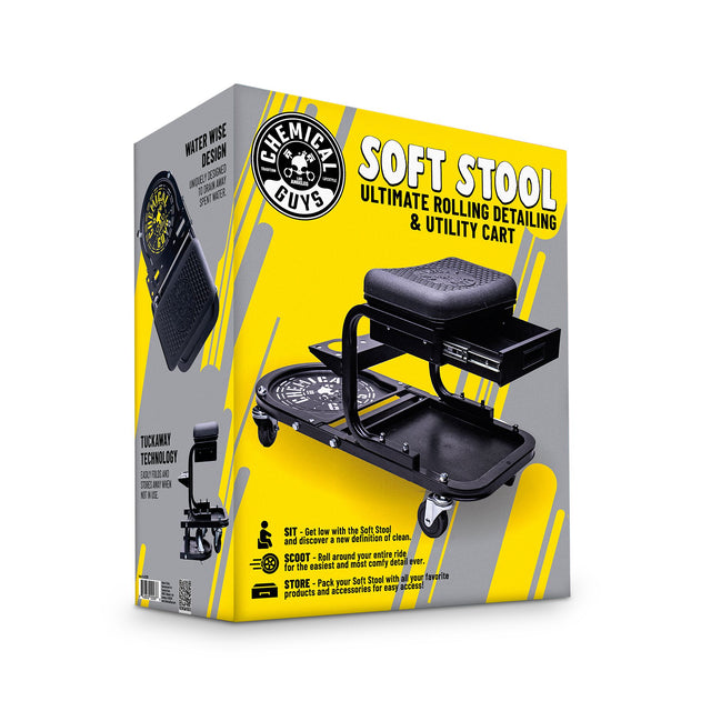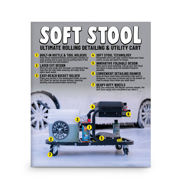 Not giving your car a signature Chemical Guys shine today? “What else can I assist you with,” says the Soft Stool. The Soft Stool is the perfect tool to get work done all around your home! Use the Soft Stool in your house, garage, office, yard, and more! The versatile stool is perfect for doing yard work, cleaning your floors, washing your pet, doing handy work around the house, and more. When you’re done, the Soft Stool’s Tuckaway Technology allows you to conveniently fold it up so you can stow it away while leaving the smallest footprint possible. The uses are virtually endless with the Soft Stool Ultimate Rolling Detailing & Utility Cart!