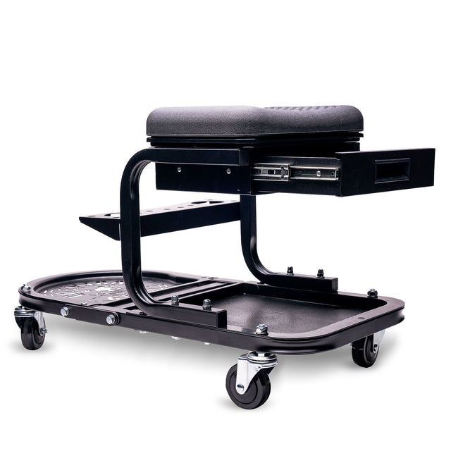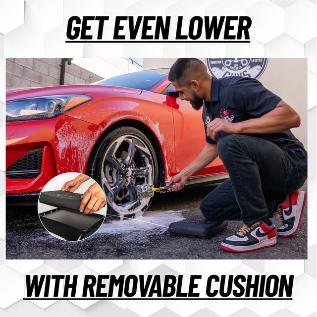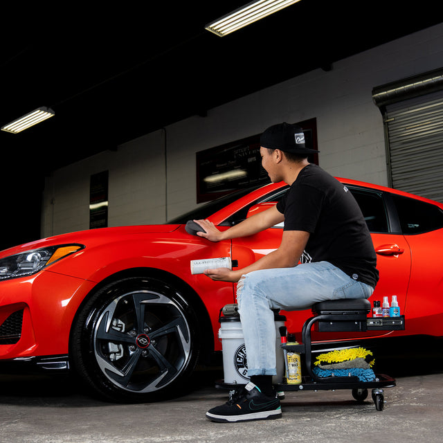 Giving your car a beautiful shine can be hard work. Detailing wheels and rims, bumpers and trim means bending over and getting low. The Soft Stool offers you a comfortable seat to sit on so you can easily detail every nook and cranny of your vehicle! Need to get even lower? The Soft Stool’s soft cushion is removable, so you can take it out and set it on the floor to keep your knees happy while you hit those extra low areas. The bucket holder, bottle holders, under-seat shelf, and detailing drawer keep all your tools close by and the Soft Stool’s four, fully rotating wheels allow you to easily and comfortably move around your vehicle for ultimate comfort and convenience.