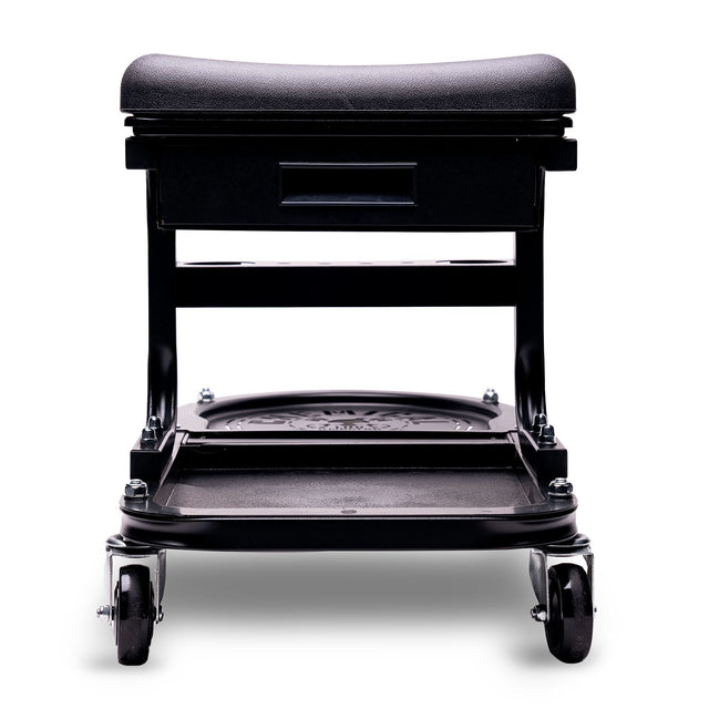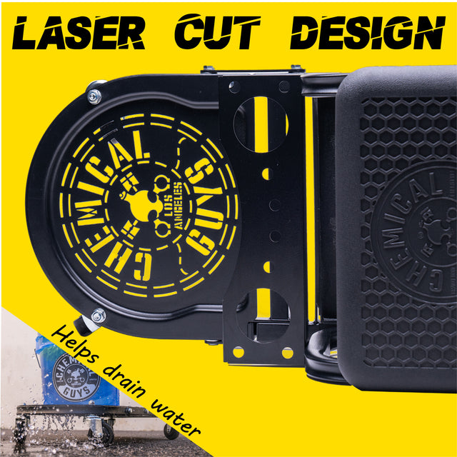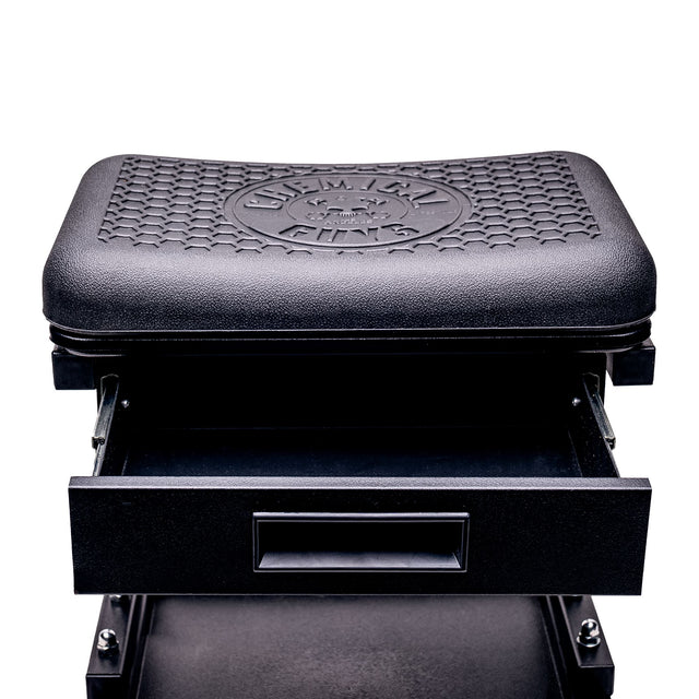 The Soft Stool is the perfect accessory for any in-depth detail. Whether you’re washing, claying, polishing, or waxing your ride, the Soft Stool makes all steps of the detailing process effortless. The easy to reach bucket holder keeps your bucket conveniently placed wherever you go, and the laser cut Chemical Guys logo creates the perfect drainage port for overflow water. Two larger holders, and four smaller holders sit in the convenient shelf above the bucket holder so you can easily store whatever you need to get the job done, while the detailing drawer pulls out from beneath the seat to store smaller tools and brushes. Your arsenal will never be out of reach with the Soft Stool Ultimate Rolling Detailing & Utility Cart!