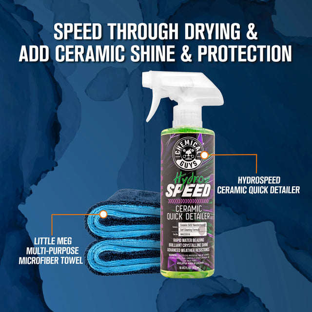 HydroSpeed Quick Detailer adds brilliant ceramic shine, lasting protection, and intense hydrophobic water beading with every spray. It applies easily in seconds and works on virtually all exterior surfaces, so you can maintain gloss and protection between washes or on top of your favorite wax or sealant. Use Little Megalodon to apply HydroSpeed and finish surfaces with a streak-free finish in fewer passes.