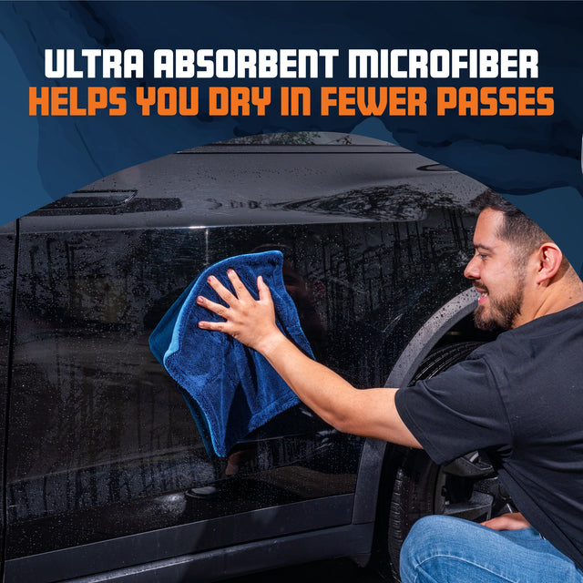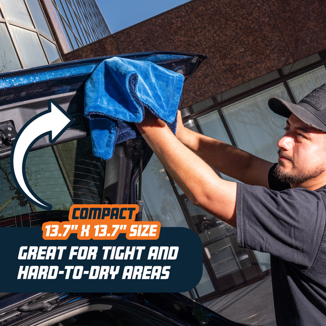 Use this ultra-versatile towel for everything from exterior drying to interior finishing. Use it wet for drying paint, glass, and trim, or dry for interior dusting on dashboards, center consoles, screens, and other hard surfaces. The compact 13.7” x 13.7” size makes it easy to maneuver around tight and hard-to-reach areas while still delivering serious drying power on larger panels and is ideal for use after a car wash to wipe away any lingering drips. Each kit includes two towels, making it easy to dry faster using both hands or keep one ready for interior cleaning and final touch-ups.