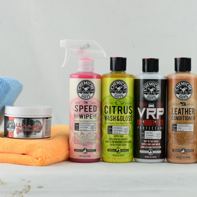 Begin the regimen by washing away layers of stuck-on dirt and filth with Citrus Wash & Gloss, using its natural citrus-cleaning power. Use the Professional Grade Premium Microfiber Towel With Silk Edges for a careful dry that will not leave paint with any scratches or swirls. Shine and protect your wheels and black trim by using a combination of VRP Super Shine Dressing, and Wheel Guard Wheel and Rim Wax against the toughest filth from the road.