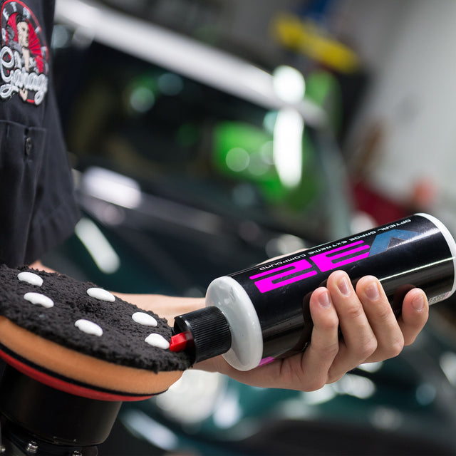 Pair V32 with a rotary polisher for an aggressive cutting combination to take down heavy defects quickly, or use V32 with a dual action polisher for fast cutting action that is safe for any paint type and finish.