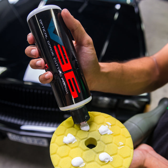 Use a dual-action polisher or rotary polisher. With a dual-action polisher, you’ll use 4-5 drops and moderate pressure until the product becomes clear. With a rotary polisher, you’ll use 4-5 drops and just the weight of the machine until the product becomes clear. Remove residue with a clean microfiber towel. Watch our demo video for a step-by-step demonstration.