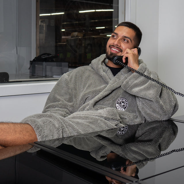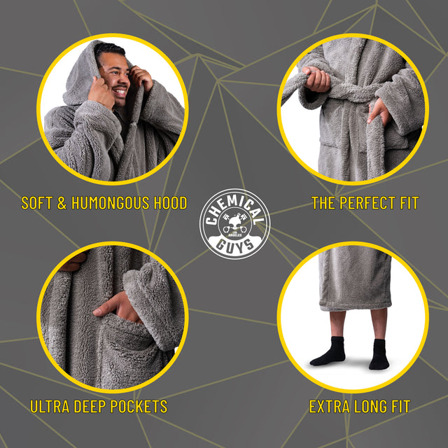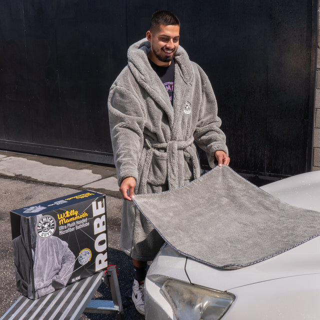Made of the same extra plush, ultra high pile microfiber as the Woolly Mammoth Towel, this lavish bath robe features a super soft hood, two ultra deep front pockets, an extra long length, and a fluffy belt so you can dry off fast, wrap yourself in warmth, and enjoy superior comfort all day long. After spending hours working hard, relax with the premium plushness and primal comfort of the Chemical Guys Woolly Mammoth Bathrobe! Use it after the shower, when you’re chilling around the house, or when you’re just feeling lazy and want to bask in ultimate comfort!